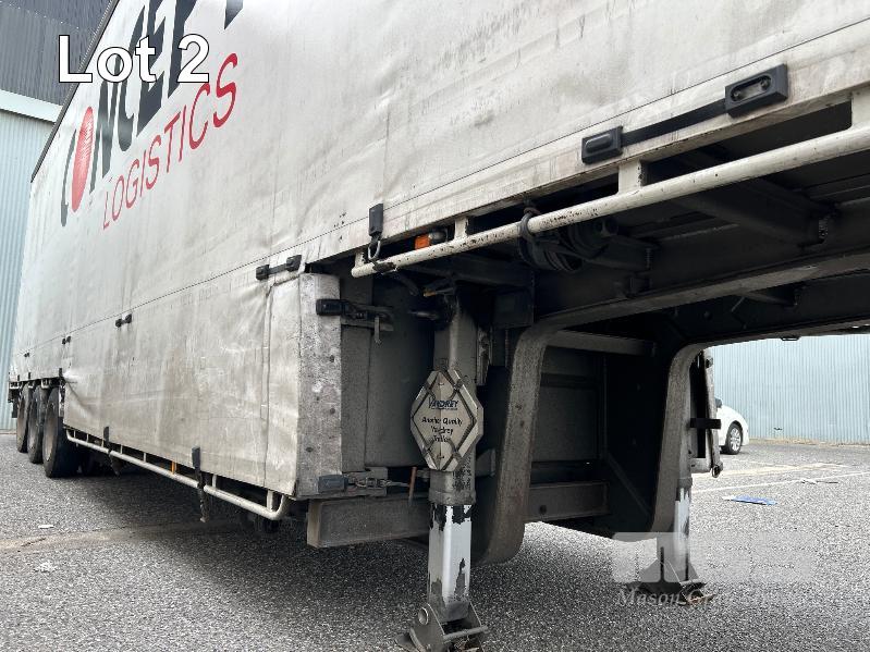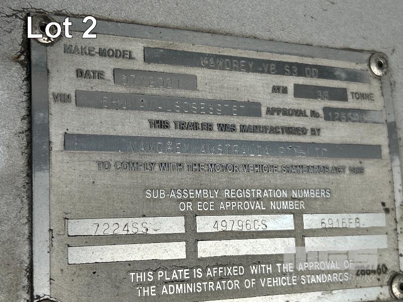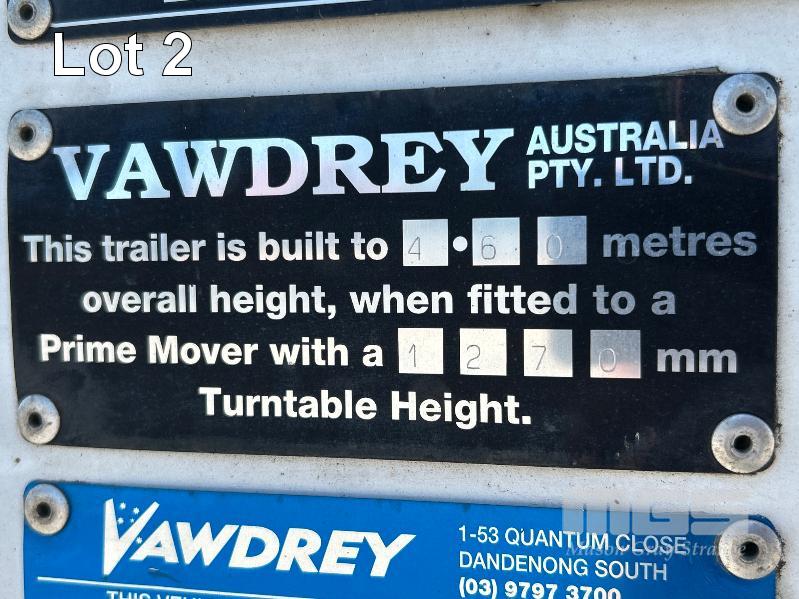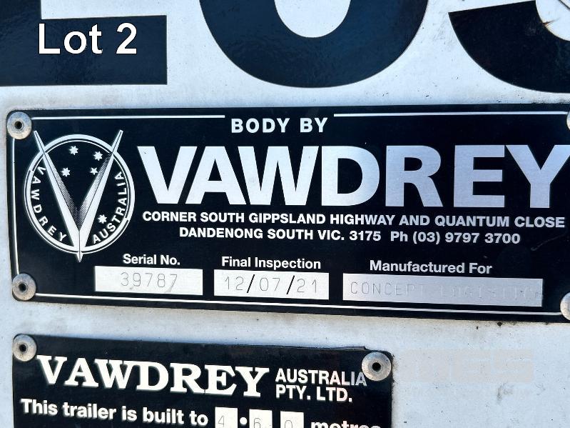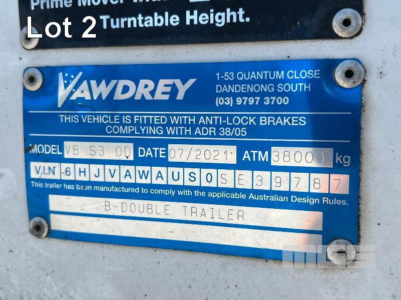 2021 VAWDREY 45' TAUTLINER DROP DECK B TRAILER MODEL: VB S3 00 TITELINER REG: YV 68 MF VIN / CHASSIS: 6HJVAWAUS0SE39787 HUBOMETER: 674,738 SHOWING ATM: 38 TONNE B DOUBLE, AIRBAG SUSPENSION, 275/70R22.5, FITTED WITH 1 x MEZZANINE DESK, GATES & NOSE CONE UNDER TRAY TOOL BOX TRAILER HEIGHT: 4.6m (NO PAPERS)