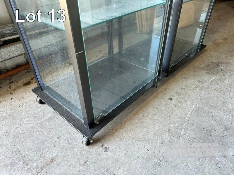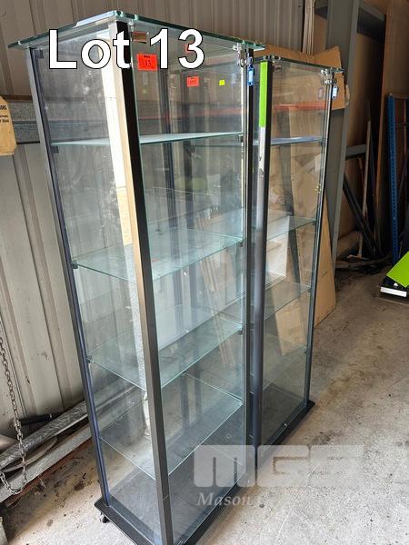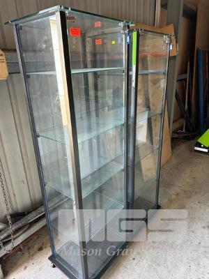 2 x GLASS DISPLAY CABINETS, LOCKABLE WITH KEYS, EACH 180 x 54 x 40cm (1 x MOBILE)