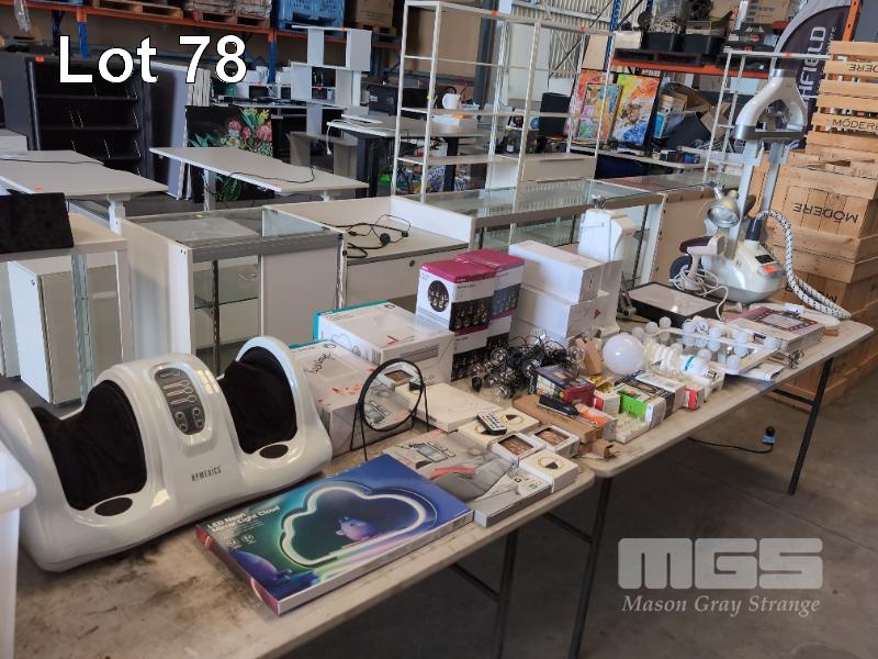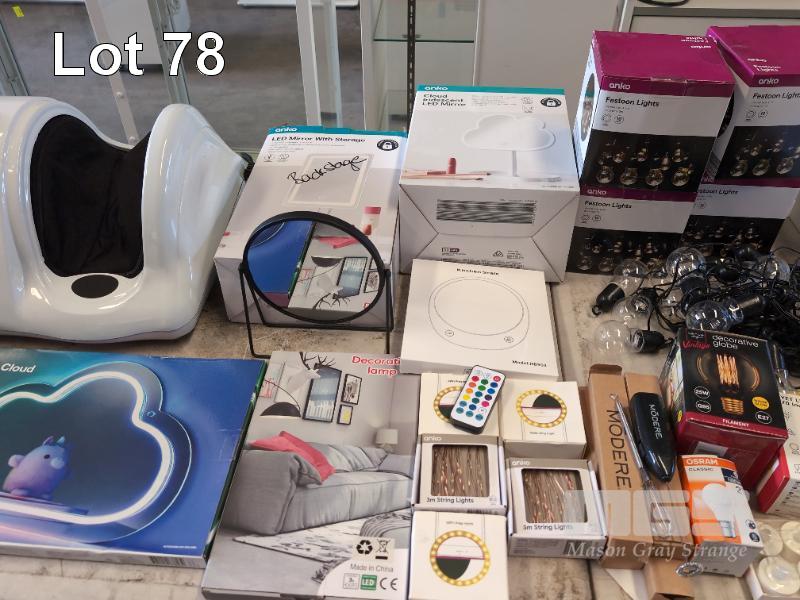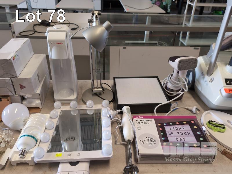 QTY ELECTRICAL GOODS. SUNBEAM SG3000 GARMENT STEAMER, SUNBEAM HAND STEAMER, ANKO MULTI COLOUR LIGHT BOX, SODA KING, LIGHT GLOBES, VANITY MIRRORS, HOMEDICS FOOT MASSAGER ETC.