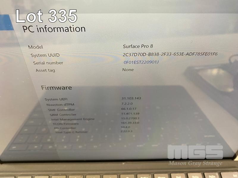 TABLET PC, MICROSOFT SURFACE PRO 8, MODEL 1982, CORE i5 1145G7 (11TH GEN) @ 2.6GHz, 16GB DDR4 RAM, 256GB NVMe M.2 SSD, 13" TOUCHSCREEN (2880x1920), INTEL IRIS Xe GRAPHICS, Wi-Fi, CELLULAR, BLUETOOTH, WINDOWS 11 PRO INSTALLED, KEYBOARD TYPE COVER, CASE & POWER SUPPLY S/N:0F01EST220901J
