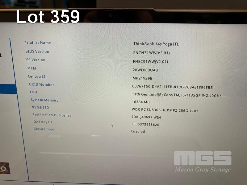 LAPTOP, LENOVO THINKBOOK 14s YOGA ITL, TYPE 20WE, CORE i5 1135G7 (11TH GEN) @ 2.4GHz, 16GB DDR4 RAM, 256GB NVMe M.2 SSD, 14" TOUCHSCREEN (1920x1080), INTEL IRIS Xe GRAPHICS, Wi-Fi, BLUETOOTH, WINDOWS 11 PRO INSTALLED & USB-C POWER SUPPLY S/N:MP21VZ9B