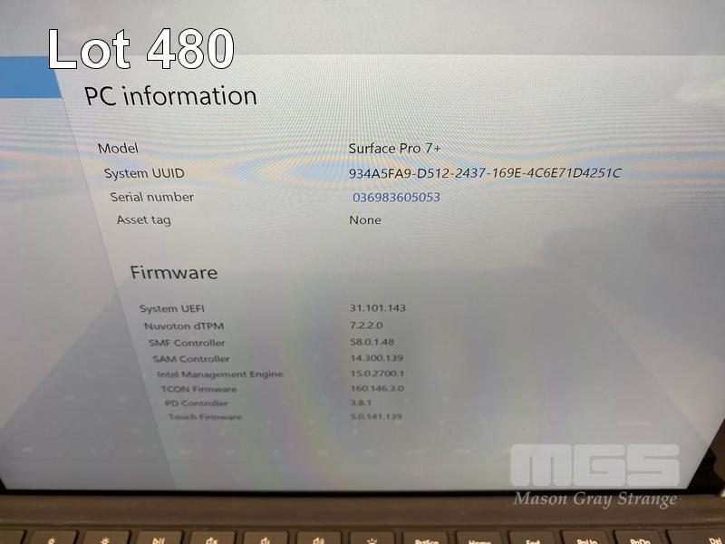 TABLET PC, MICROSOFT SURFACE PRO 7+, MODEL 1961, CORE i5 1135G7 (11TH GEN) @ 2.4GHz, 16GB DDR4 RAM, 256GB NVMe M.2 SSD, 12.3" TOUCHSCREEN (2736x1824), INTEL IRIS Xe GRAPHICS, Wi-Fi, CELLULAR, BLUETOOTH, WINDOWS 11 PRO INSTALLED, KEYBOARD TYPE COVER, CASE & POWER SUPPLY S/N:036983605053