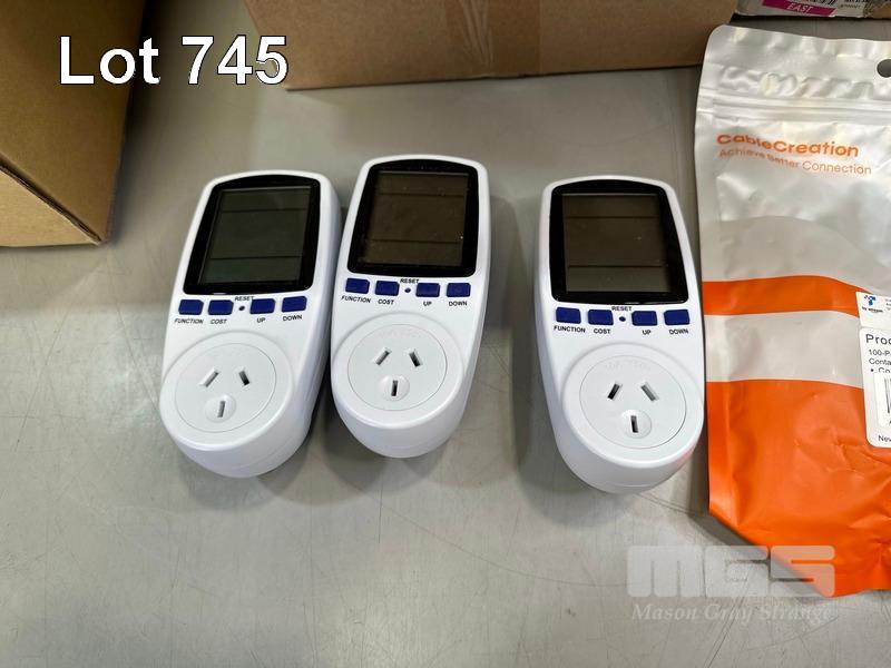 1 x BOX OF ASST CAT5e NETWORK CABLES, 1 x BOX APPROX 50 x IEC POWER CABLES 100-PACK CAT 6 UTP CONNECTOR, GOLD PLATED, TRANSPARENT 3 x POWER BOARDS, 3 x WATT METERS