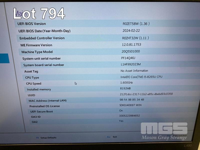 LAPTOP, LENOVO THINKPAD L490, TYPE 20Q5, CORE i5 8265U (8TH GEN) @ 1.6GHz, 8GB DDR4 RAM, 256GB NVMe M.2 SSD, 14" WIDESCREEN (1920x1080), INTEL UHD GRAPHICS, Wi-Fi, BLUETOOTH, WINDOWS 11 PRO INSTALLED (NO USB-C POWER SUPPLY) S/N:PF14Q46J