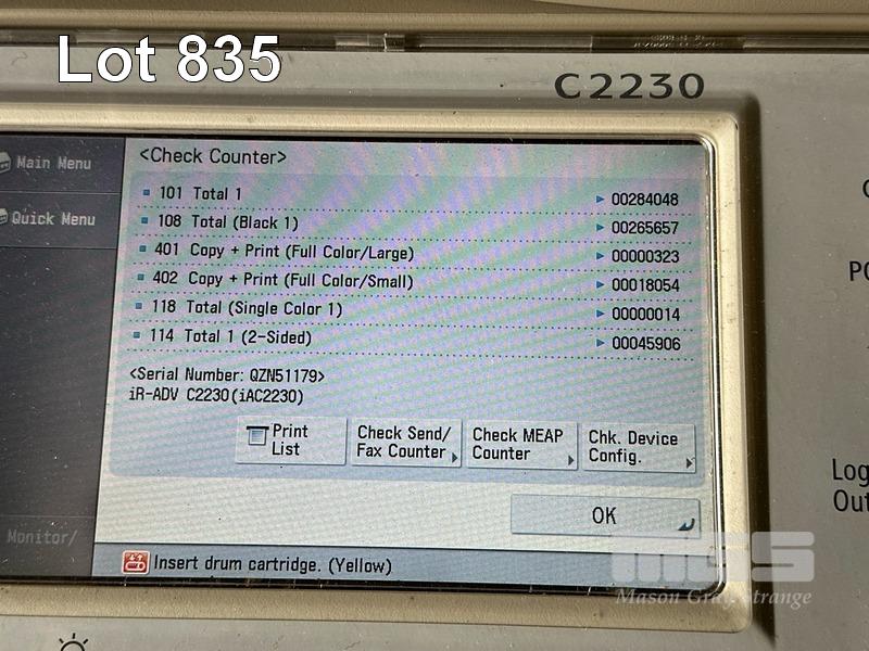 PHOTOCOPIER, CANON imageRUNNER ADVANCE C2230 COLOUR DIGITAL, ADF, PRINTER USB & NETWORK PORTS, 18,391 COLOUR & 265,657 B&W COPIES SHOWING (TEST PAGE UNAVAILABLE) WITH SPARE TONER CARTRIDGES (NOTE: MISSING DRUM CARTRIDGES) S/N:QZN51179