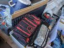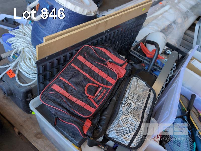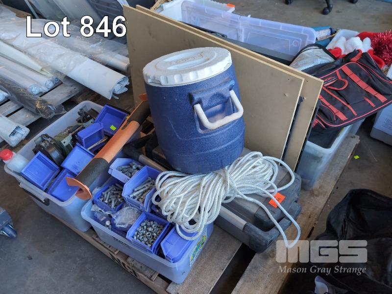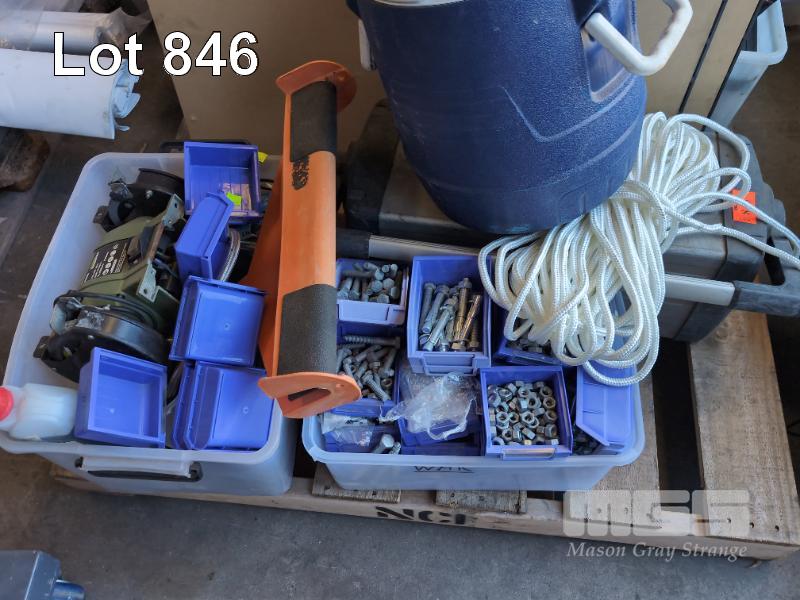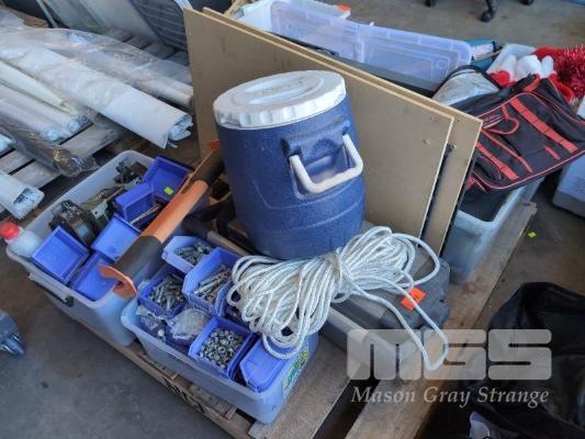 BENCH GRINDER 24V, QTY NUTS & BOLTS, STANLEY FATMAX ALUMINIUM TOOL BOX, PAINT ROLLERS AND BRUSHES, TOOL BAG, MOTORBIKE STAND, 2 X LOUVRE PANELS & TUBS, LIFTING BAR, ESKY ETC