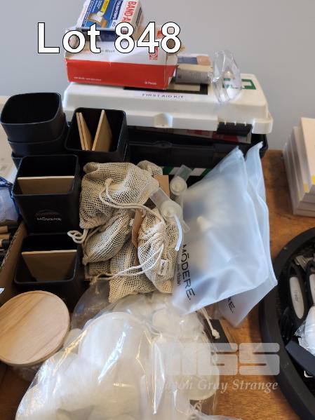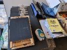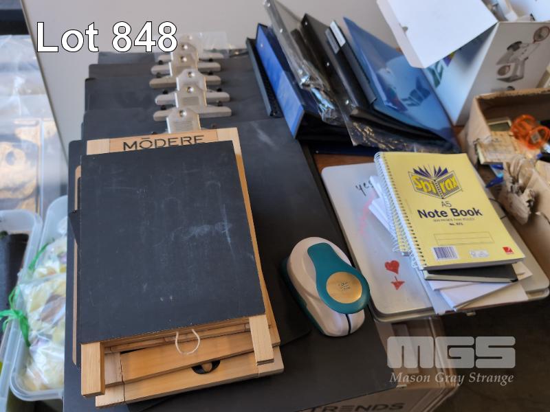 QTY OFFICE STATIONARY SUPPLIES. INC FIRST AID KIT, CLIPBOARDS (VARIOUS SIZES), MINI CHALK BOARDS, TABLET STAND & QTY BRANDED NOTEBOOKS. ETC.