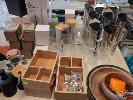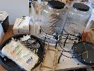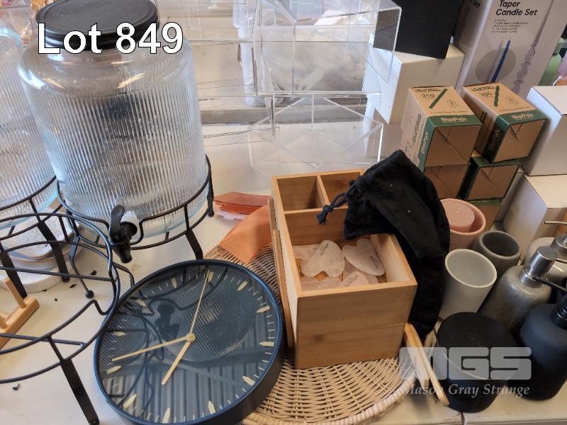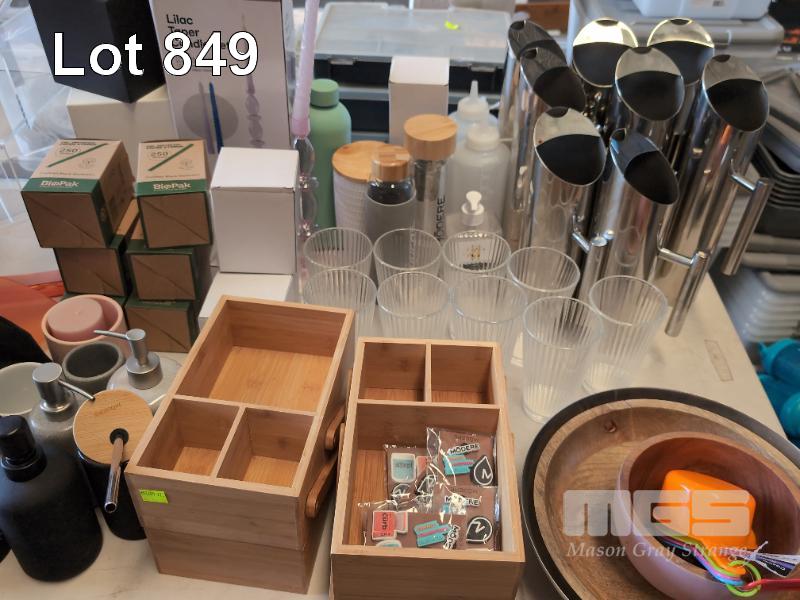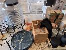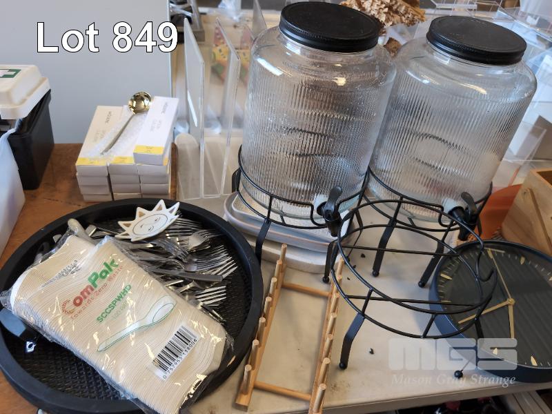 QTY OFFICE KITCHEN SUPPLIES INC STAINLESS STEEL WATER JUGS, UTENSILS, WATER URNS ETC. WALL CLOCK. QTY RETAIL DISPLAYS. QTY SODA WATER & ICED TEA.