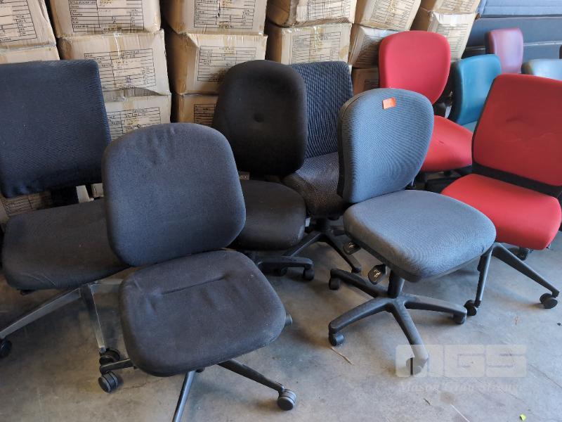 7 X FABRIC GAS LIFT OFFICE CHAIRS, VARIOUS COLOURS.