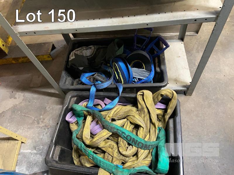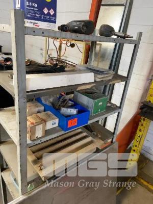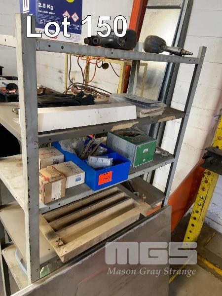 STEEL SHELF, 6 TIER & CONTENTS TIE DOWNS, LIFTING SOFT SLINGS, AIR TOOLS, 2 x IMPACT GUNS, SPRAY GUNS, STAINLESS STEEL DRIP TRAY & ROLL ORANGE PLASTIC