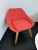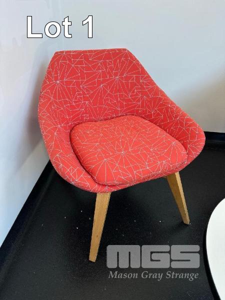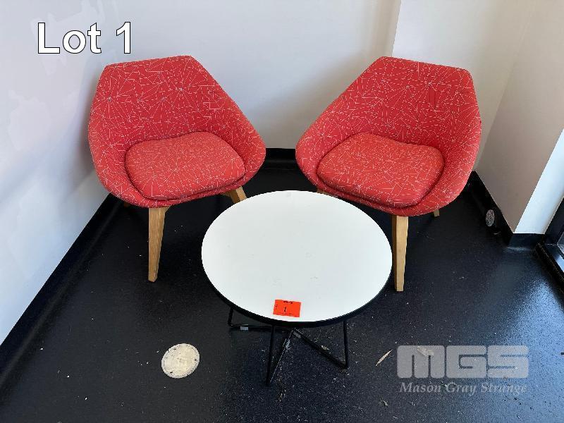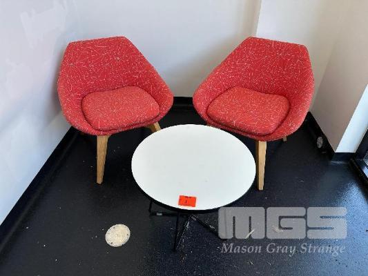 PAIR VISITORS CHAIRS, ORANGE CLOTH TIMBER LEGS,"WORKSPACE" SMALL CIRCULAR TABLE, WHTIE/BLACK 600mm (D)