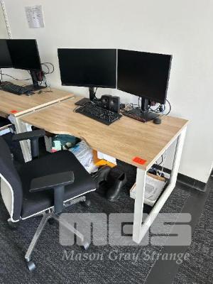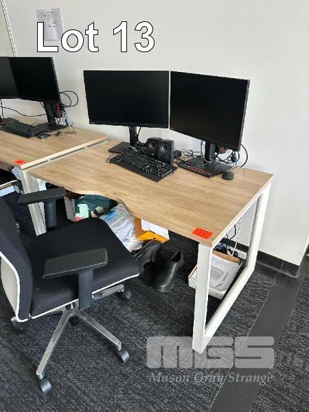 WOODGRAIN TIMBER LAMINATE DESK, WHITE STEEL FRAME 1200 x 750mm BLACK/WHITE GAS LIFT CHAIR 2 x LENOVO 24" MONITORS, MOD: T24i-20 LENOVO DOCK, GEN 2 KEYBOARD, MOUSE, SPEAKERS & HEADPHONES