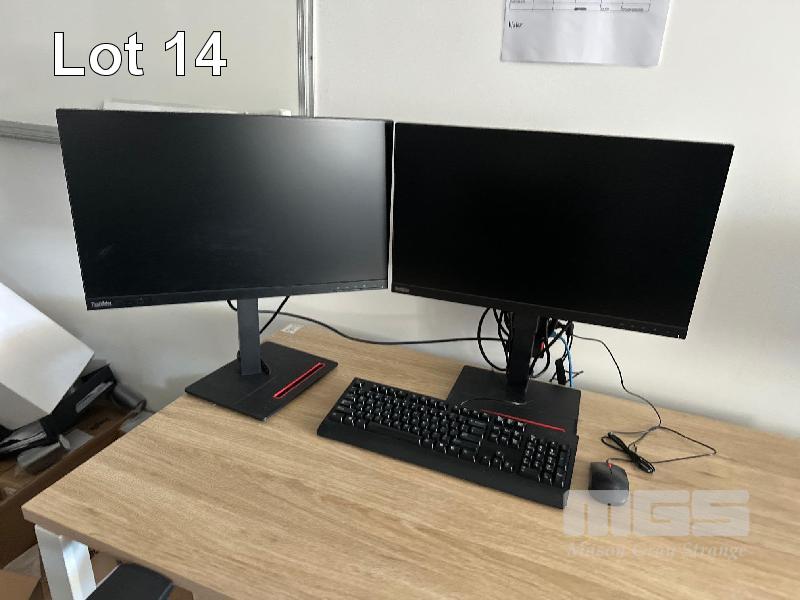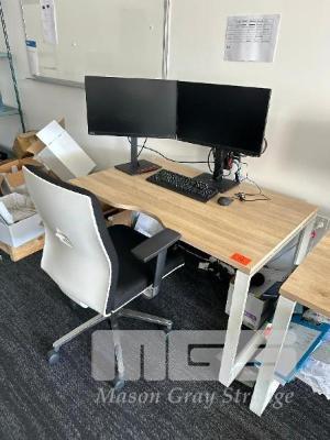 WOODGRAIN TIMBER LAMINATE DESK, WHITE STEEL FRAME 1200 x 750mm BLACK/WHITE GAS LIFT CHAIR 2 x LENOVO 24" MONITORS, MOD: T24i-20 LENOVO DOCK, GEN 2 KEYBOARD & MOUSE