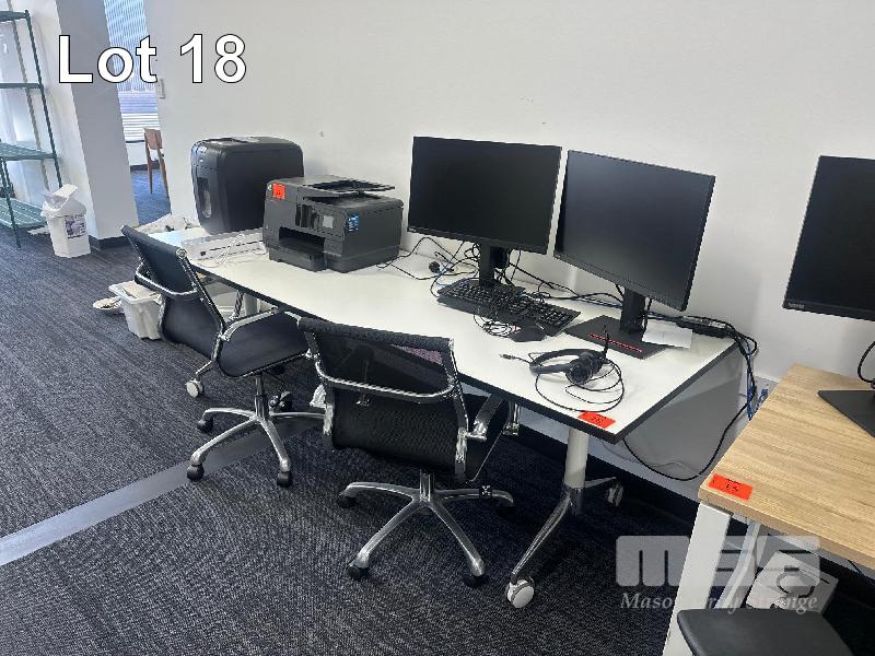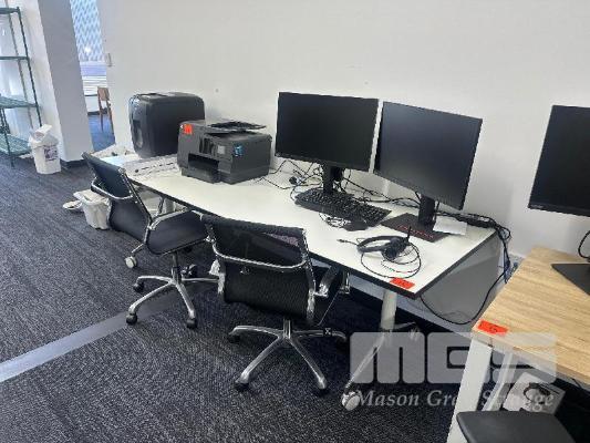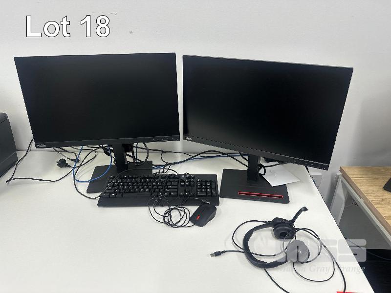 WHITE/TIMBER LAMINATE MOBILE DESK, CHROME FRAME 2400 x 800mm 2 x CHROME/BLACK GAS LIFT CHAIRS 2 x LENOVO 24" MONITORS, MOD: T24I-20 LENOVO DOCK, GEN 2 KEYBOARD, MOUSE & HEADPHONES