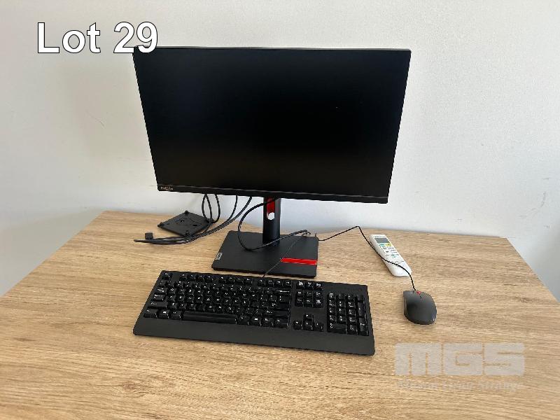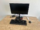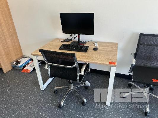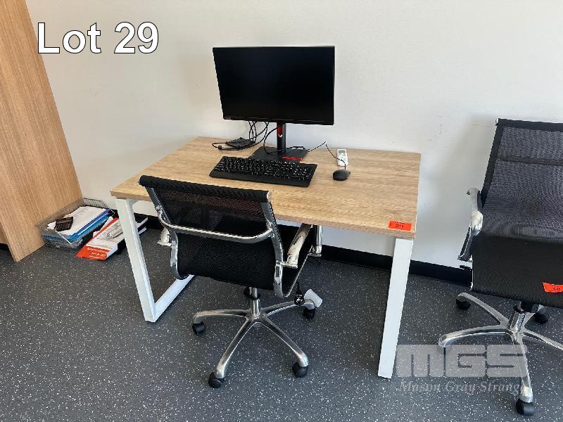 WOODGRAIN TIMBER LAMINATE DESK, WHITE STEEL FRAME 1200 x 750mm WITH BLACK/CHROME GAS LIFT CHAIR, LENOVO 24" MONITOR MOD: T24i-30 KEYBOARD & MOUSE