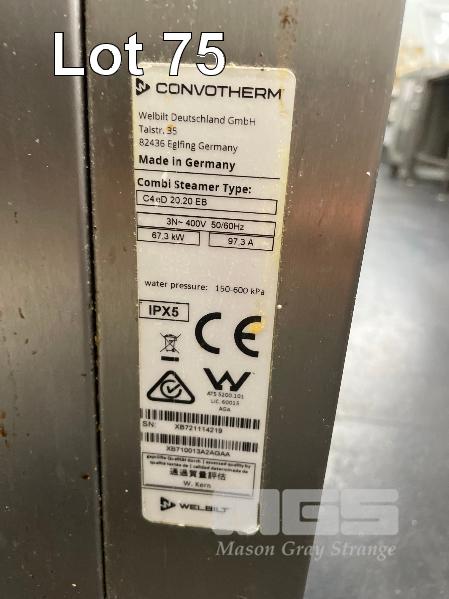 CONVOTHERM EASY DIAL ELECTRIC COMBI STEAMER OVEN, TYPE: C4eD20.20EB, SERIAL: XB721114219, POWER: 67.3kw, ADVANCED CLOSED SYSTEM+, VARIABLE FAN SPEED, 20 PAN CAP, CONVO CLEAN AUTOMATIC CLEANING SYSTEM, MODES: STEAM, COMBI STEAM & CONVECTION 415V 100AMP HARDWIRED MADE IN GERMANY WITH 19 TRANSPORT TROLLEY, 19 TRAY CAPACITY WITH 38 x STAINLESS STEEL GASTRONORM TRAYS 325 x 530 x 65mm