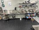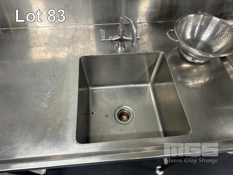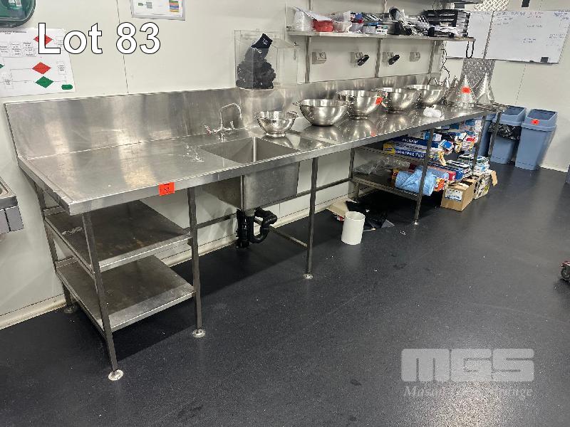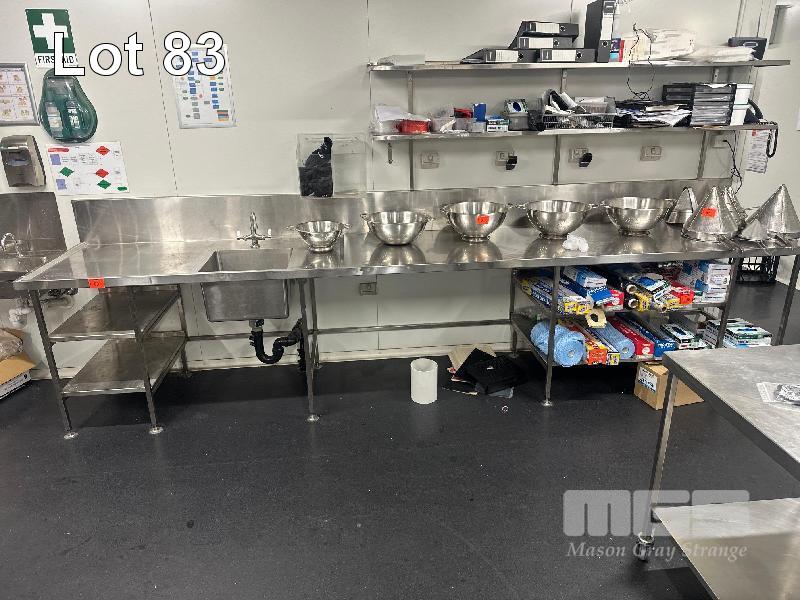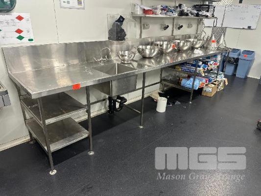 LARGE STAINLESS STEEL BENCH, 4200 x 800 x 900mm (H) WITH DEEP BOWL SINK, 450 x 450 x 290mm (D), 2 TIER SHELF UNIT, 2400 x 300mm