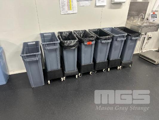 7 x PVC TRASH CANS WITH 6 x MOBILE DOLLYS