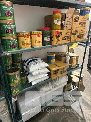 LARGE QUANTITY LONG LIFE INGREDIENTS, BEANS, JALAPENOS, PICKLES, MUSTARD, BONSOY MILK, PINEAPPLE, CHICKPEAS, CANOLA OIL, CANNELLONI, SEA SALT ETC CONTENTS SHELF UNIT