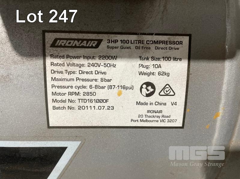 IRONAIR SILENCED AIRCOMPRESSOR, DOM: 2023, MOD: TTD161000F, 2200W, 3HP, 100L, 240V 10 AMP WITH AIR HOSE