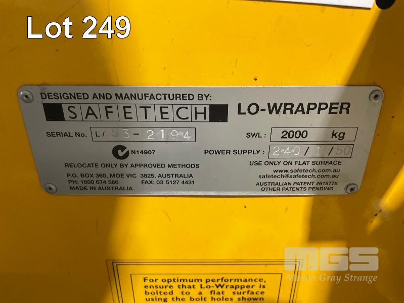 SAFETECH PALLET WRAPPER, MOD: LO-WRAPPER, SERIAL:L/S3-2194, 2000KG SWL, 240V 10 AMP WITH 8 x CARTONS PLASTIC WRAP + PART ROLLS