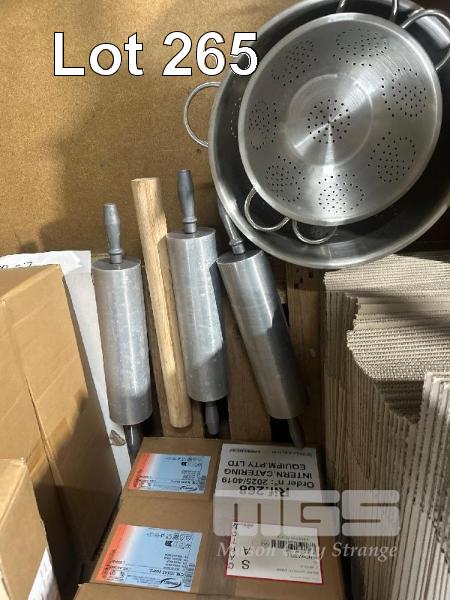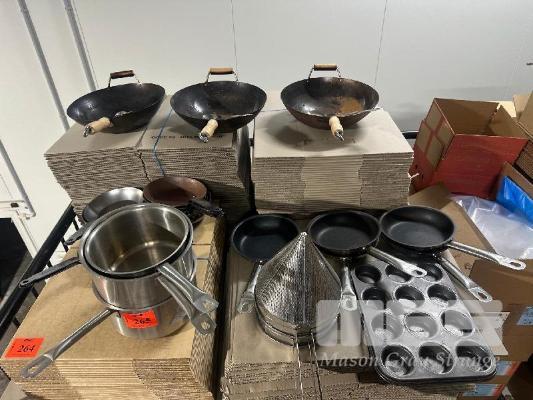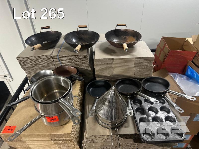3 x WOKS, 3 x POTS, 10 x WHISKS, ICE BUCKET, 3 x SIEVES, 4 x ROLLING PINS, 2 x STRAINERS, 10 x SMALL SKILLETS, 5 x FRY PANS, 2 x MUFFIN TRAYS & MANUAL OP CHIP CUTTER