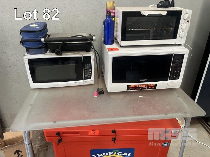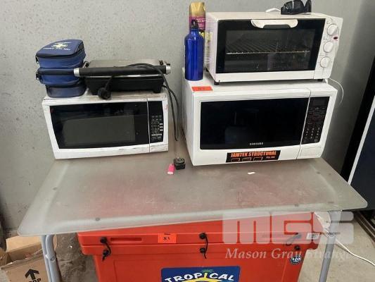 2 x MICROWAVES, TOASTER OVEN & GLASS TOPPED TABLE