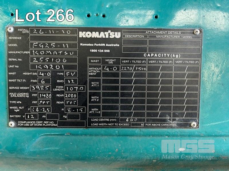 2010 FORKLIFT, KOMATSU MOD: FG25-11 HOURS: 5,946 2 STAGE MAST, SOLID CUSHION TYRES NOTE: BUYER COLLECTION BY ARRANGEMENT AFTER TUESDAY 9TH DECEMBER)