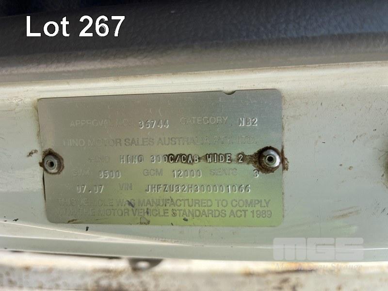 2007 HINO 300/916 C/CAB WIDE 2 TRAY TRUCK REG: X00 391 VIN: JHFZU32H300001066 ODO: 189,891kms INDICATED GVM: 8,500kg GCM: 12,000kg DIESEL, MANUAL TRANSMISSION, 5.4m TRAY