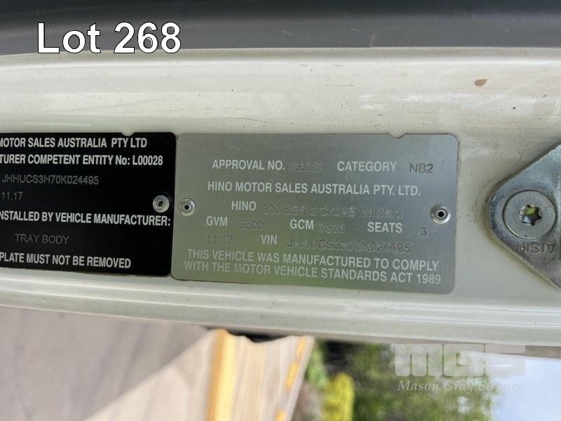 2017 HINO TRADE ACE 300/616 300 SERIES C/CAB WIDE 2 TRAY TRUCK REG: SB 60 PC VIN: JHHUCS3H70K024495 ODO: 171,431kms SHOWING GVM: 5,500kg GCM: 7,300kg DIESEL ENGINE, AUTOMATIC TRANSMISSION, MOD: XZU710R-HKTMSQ3 4.6m TRAY