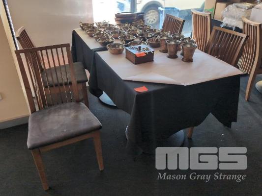 2 X DINING TABLES & 4 X PADDED BENT BACK DINING CHAIRS. TABLES 800 X 800 MM, RAW MDF TOPS WITH HEAVY STEEL BASE INC. TABLECLOTHS.