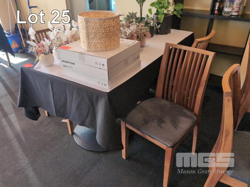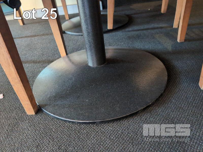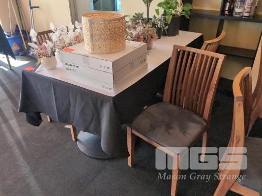 2 X DINING TABLES & 4 X PADDED BENT BACK DINING CHAIRS. TABLES 800 X 800 MM, RAW MDF TOPS WITH HEAVY STEEL BASE INC. TABLECLOTHS.