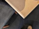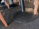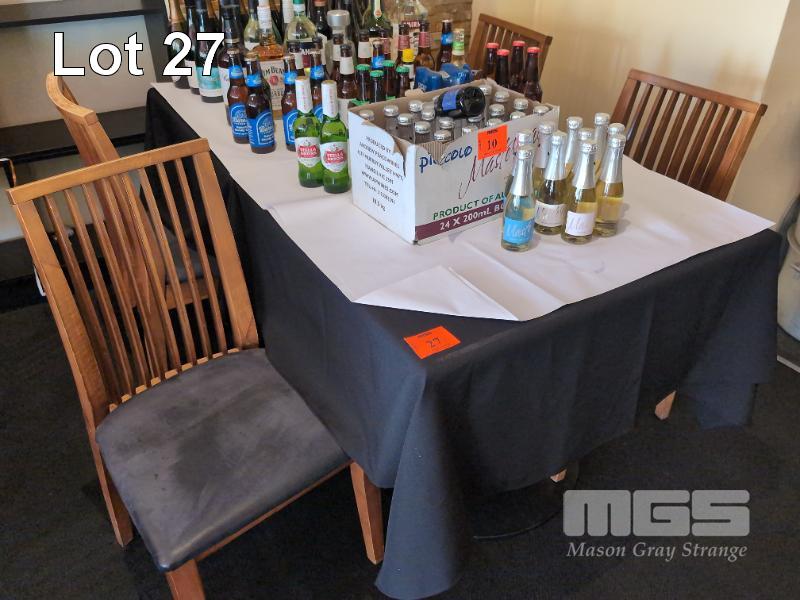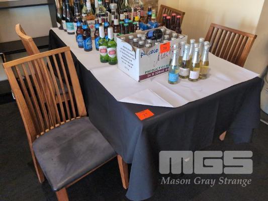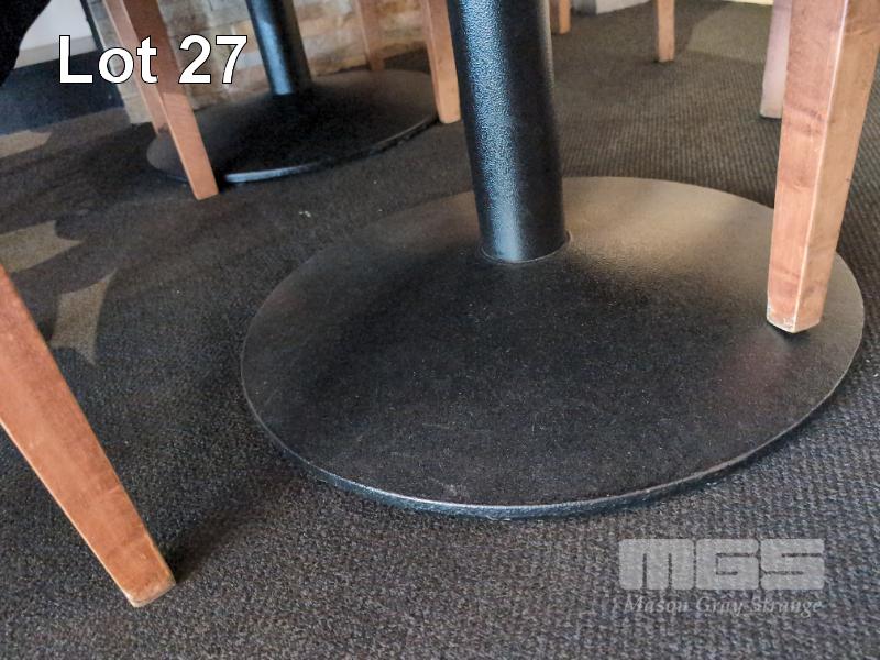 2 X DINING TABLES & 4 X PADDED BENT BACK DINING CHAIRS. TABLES 800 X 800 MM, RAW MDF TOPS WITH HEAVY STEEL BASE INC. TABLECLOTHS.