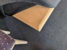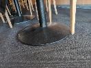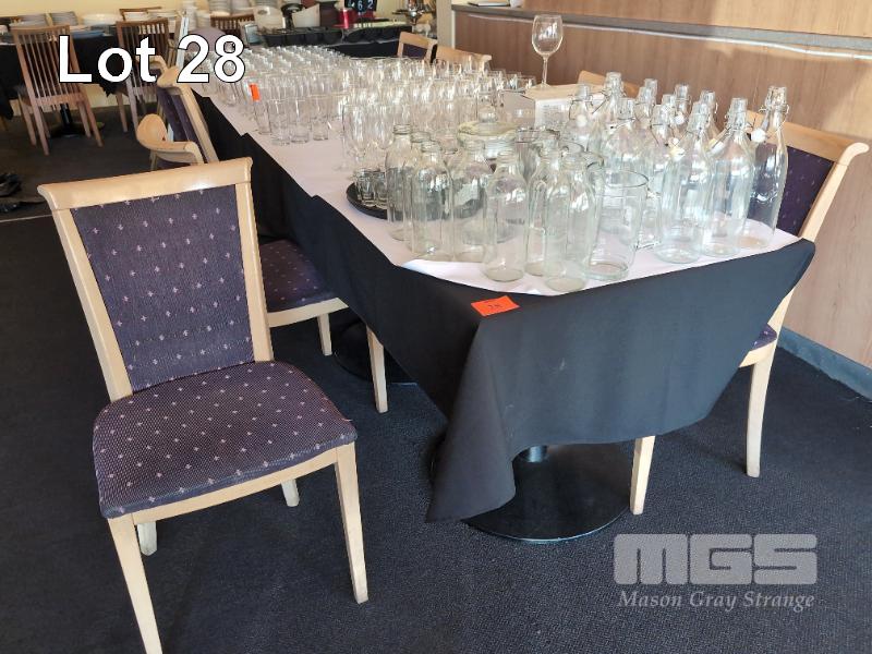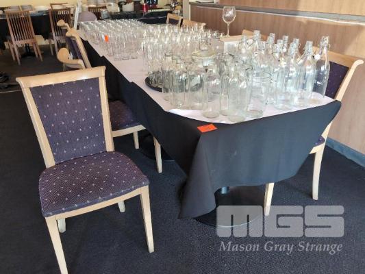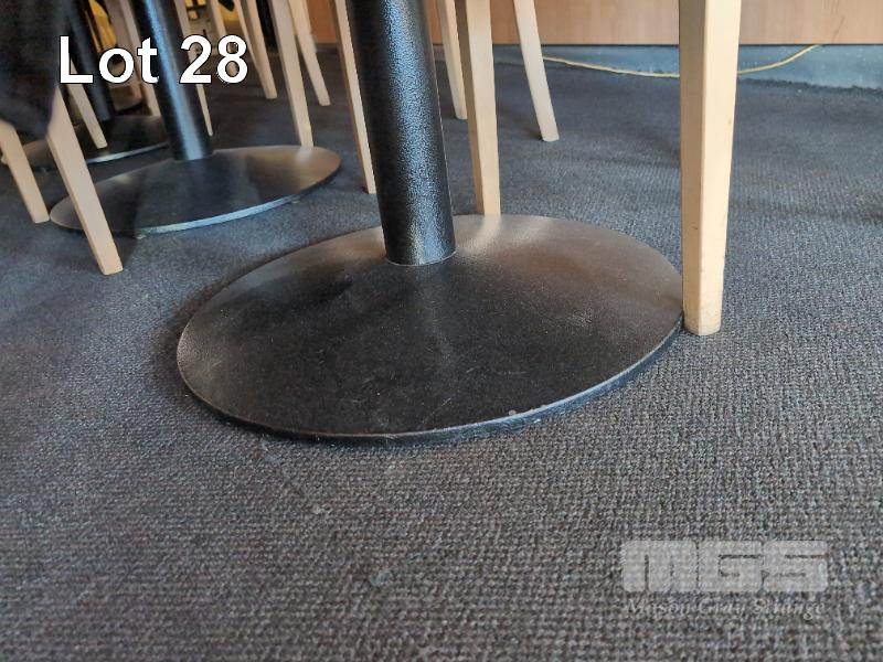 4 X DINING TABLES & 8 X PADDED CURVED BACK DINING CHAIRS. TABLES 800 X 800 MM, RAW MDF TOPS WITH HEAVY STEEL BASE INC. TABLECLOTHS.