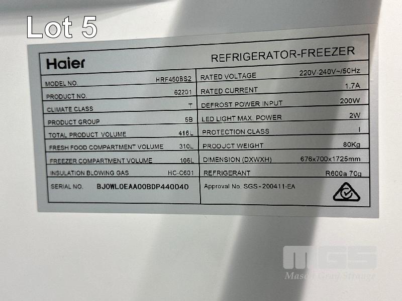 HAIER FRIDGE/FREEZER, MOD: HRF450BS2, 416L CAP, 240V 10AMP