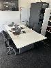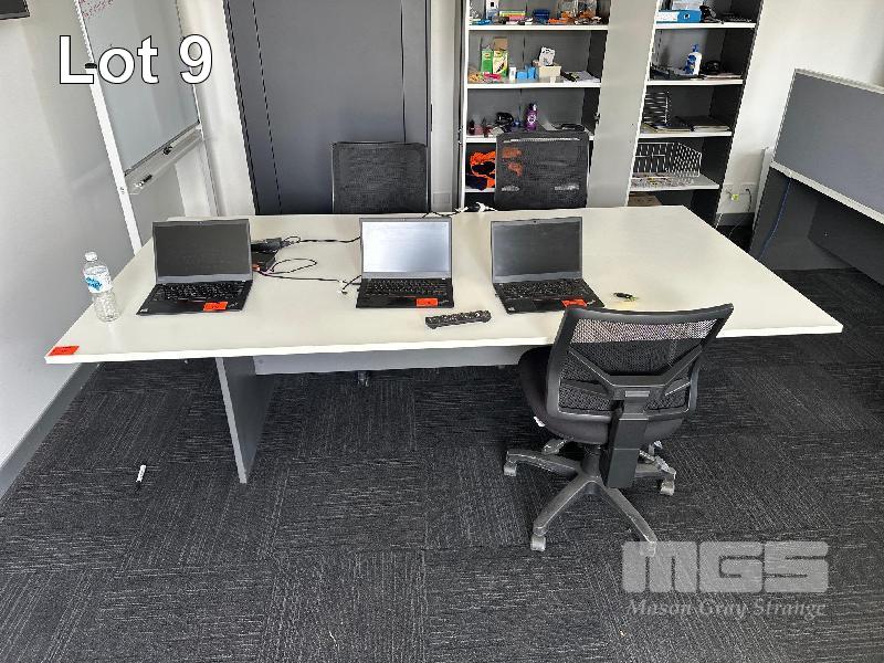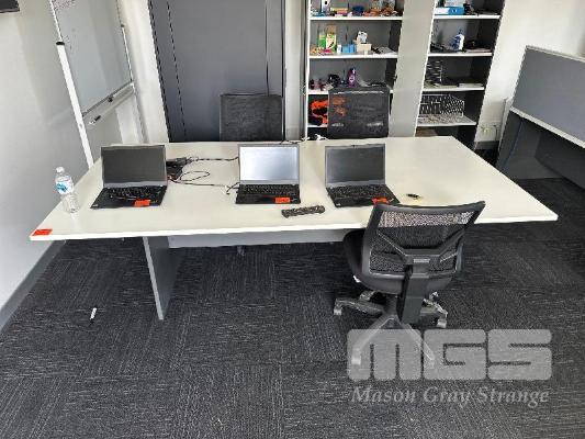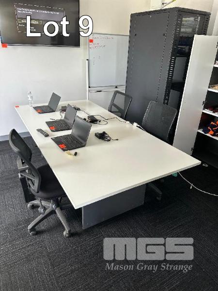 WHITE TIMBER LAMINATE MEETING TABLE, 2400 x 1200mm WITH 4 x BLACK MESH GAS LIFT CHAIRS