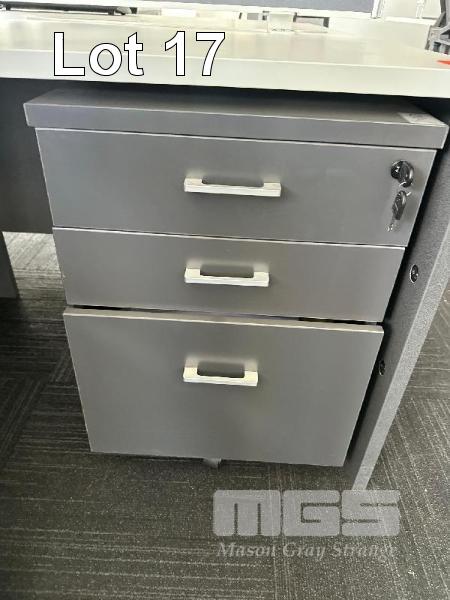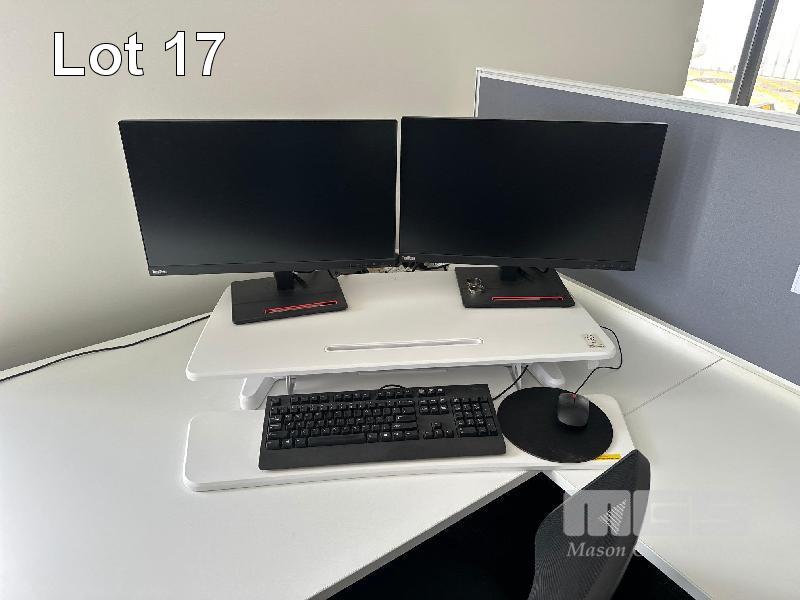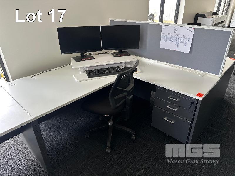 WHITE TIMBER LAMINATE DESK & RETURN, 1800 x 1800mm, PIN BOARD OFFICE PARTITION, MONITOR RISER, 3 DRAWER UNDER DESK MOBILE, BLACK MESH GAS LIFT CHAIR 2 x LENOVO 24" MONITORS, MOD: T24i-20, KEYBOARD & MOUSE