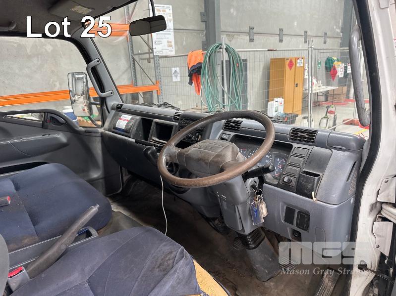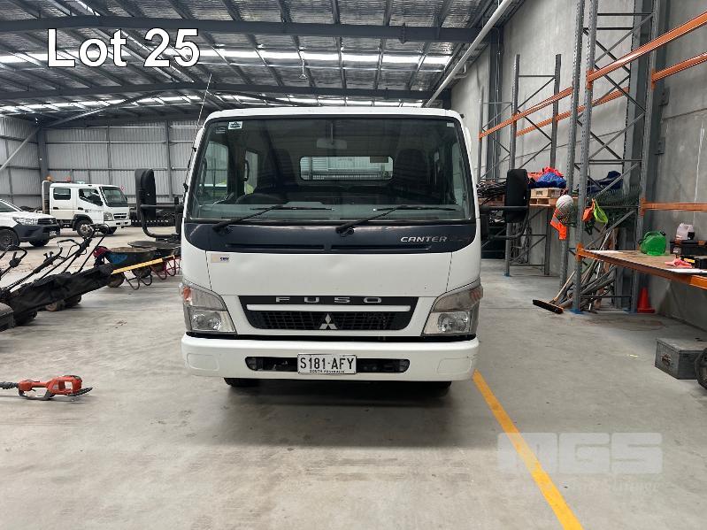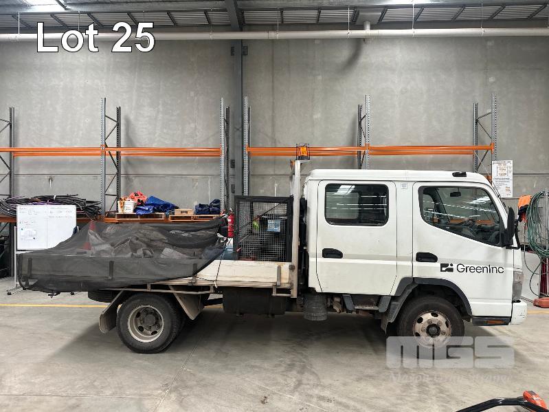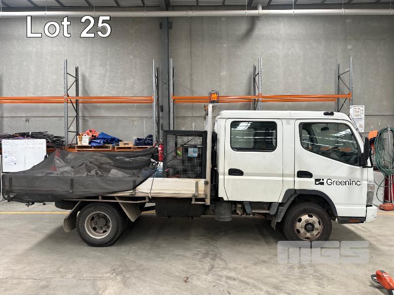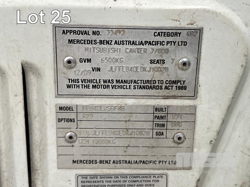 2009 MITSUBISHI CANTER 3.5T 7/600 FE84DEWSRFAB 4X2 CREW CAB REG: S181AFY VIN: JLFFE840E0KJ10028 ODO: 176,563 GVM: 6500 GCM: 10,000 5 SPEED MANUAL, DIESEL, WHITE, 4 DOORS, 7 SEAT, ALLOY TRAY, 3200mm, DROP SIDE LOCK UP CAGE BEACON & LIGHT BAR (WITH 1 KEY/S)