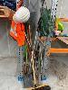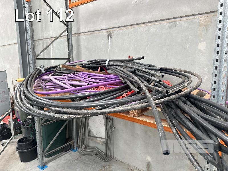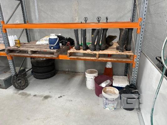 CONTENTS OF PALLET RACKING, LANDSCAPING TOOLS, SPARE TRAILER WHEELS, TARPS, GUMBOOTS ETC.