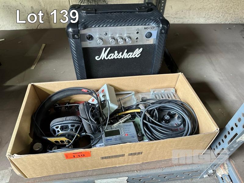 MARSHALL PRACTICE AMP MG10CF WITH ASST EFFECTS PEDALS, HEADPHONES, CABLES, TUNER ETC