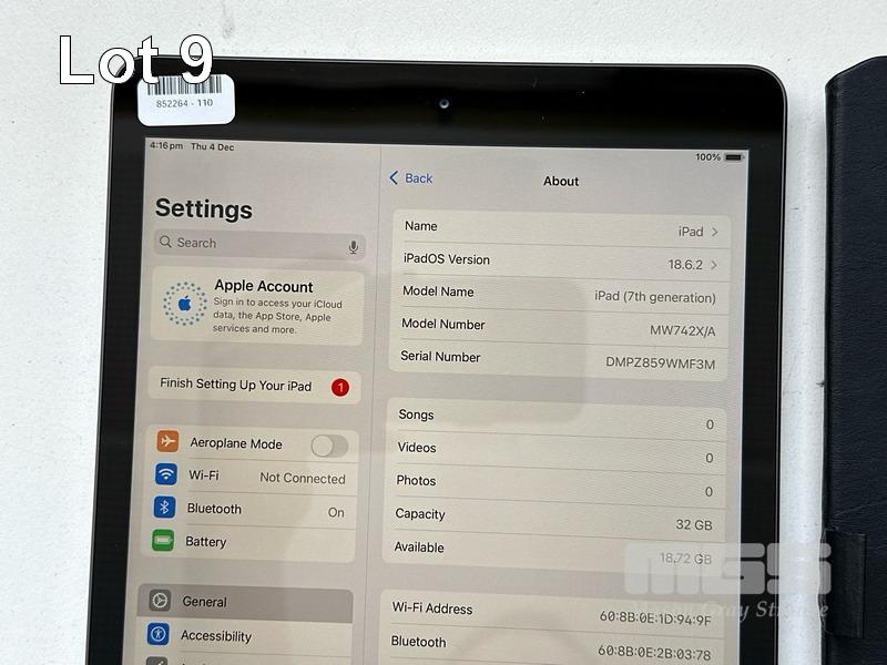 APPLE iPAD 7TH GEN, 32GB, Wi-Fi, SPACE GREY, MODEL MW742X/A, A2197 WITH COVER (NO CABLE, NO CHARGER) S/N:DMPZ859WMF3M