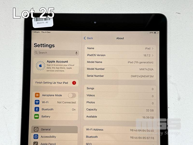 APPLE iPAD 7TH GEN, 32GB, Wi-Fi, SPACE GREY, MODEL MW742X/A, A2197 WITH CABLE & CHARGER S/N:DMPZ4QNEMF3M