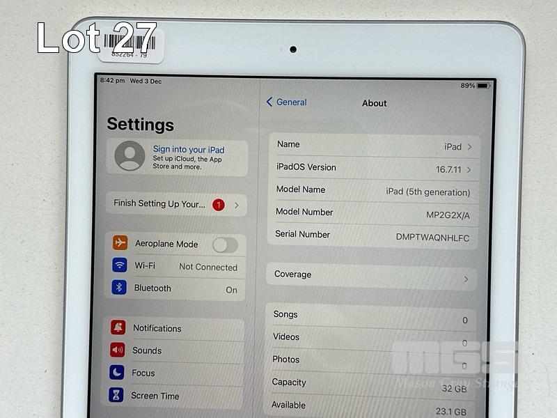 APPLE iPAD 5TH GEN, 32GB, Wi-Fi, SILVER, MODEL MP2G2X/A, A1822 (NO CABLE, NO CHARGER) S/N:DMPTWAQNHLFC