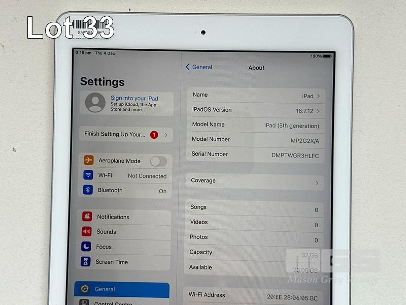 APPLE iPAD 5TH GEN, 32GB, Wi-Fi, SILVER, MODEL MP2G2X/A, A1822 (NO CABLE, NO CHARGER) S/N:DMPTWGR3HLFC