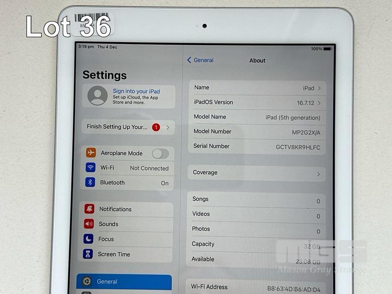 APPLE iPAD 5TH GEN, 32GB, Wi-Fi, SILVER, MODEL MP2G2X/A, A1822 (NO CABLE, NO CHARGER) S/N:GCTV8KR9HLFC