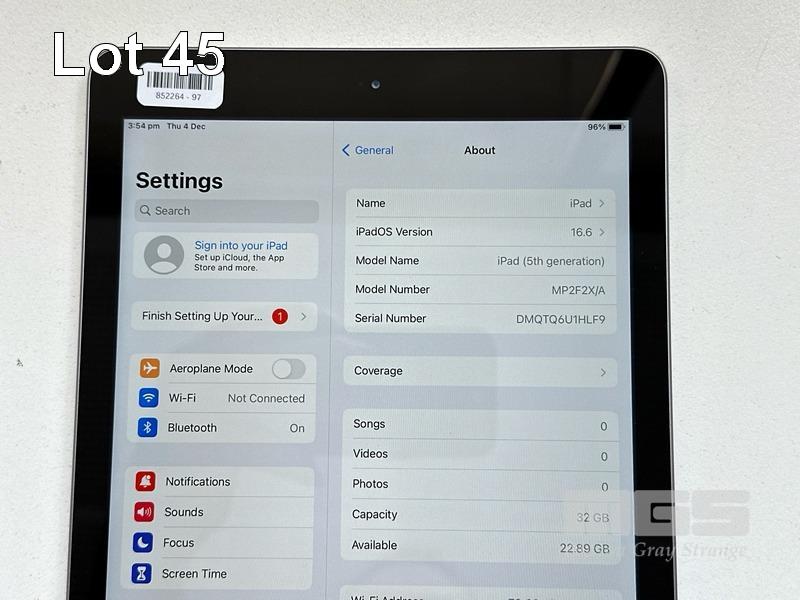 APPLE iPAD 5TH GEN, 32GB, Wi-Fi, SPACE GREY, MODEL MP2F2X/A, A1822 (NO CABLE, NO CHARGER) S/N:DMQTQ6U1HLF9