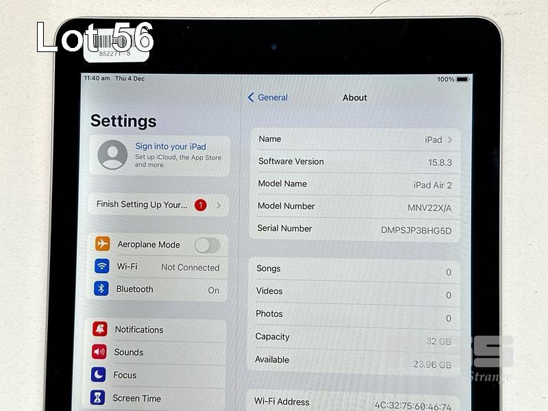 APPLE iPAD AIR 2, 32GB, Wi-Fi, SPACE GREY, MODEL MNV22X/A, A1566 (NO CABLE, NO CHARGER) S/N:DMPSJP3BHG5D