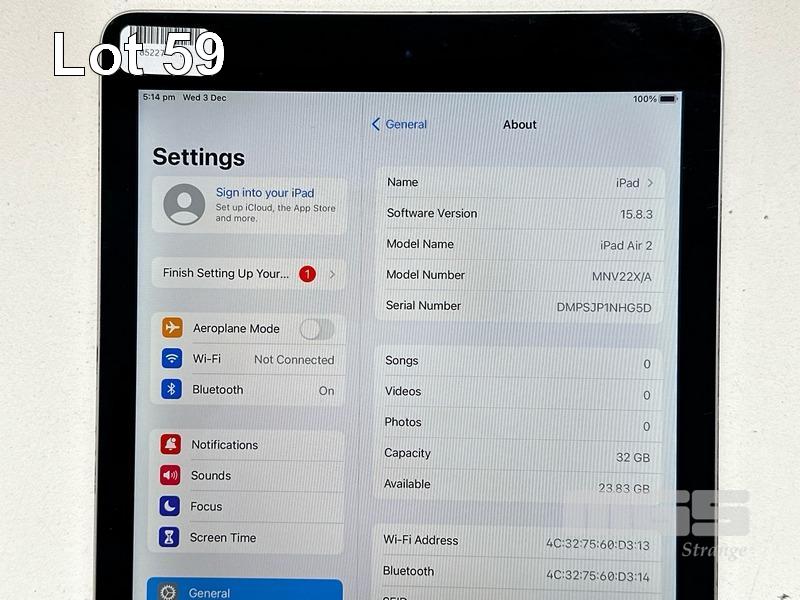 APPLE iPAD AIR 2, 32GB, Wi-Fi, SPACE GREY, MODEL MNV22X/A, A1566 (NO CABLE, NO CHARGER) S/N:DMPSJP1NHG5D