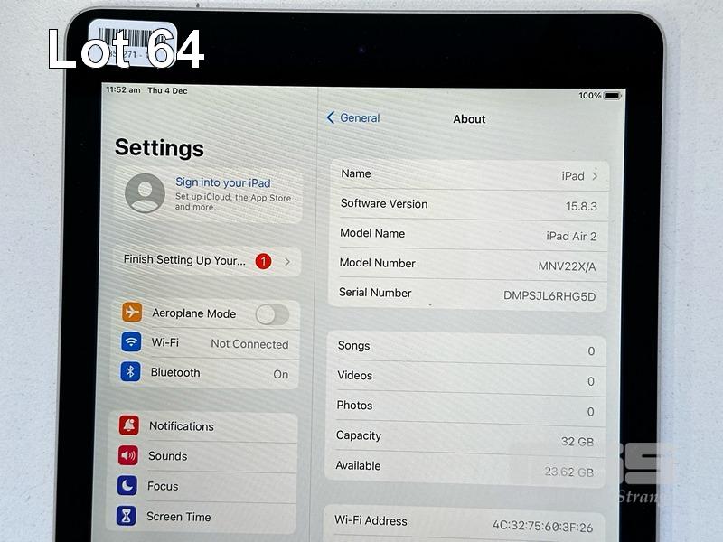 APPLE iPAD AIR 2, 32GB, Wi-Fi, SPACE GREY, MODEL MNV22X/A, A1566 (NO CABLE, NO CHARGER) S/N:DMPSJL6RHG5D