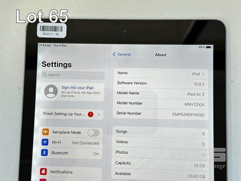 APPLE iPAD AIR 2, 32GB, Wi-Fi, SPACE GREY, MODEL MNV22X/A, A1566 (NO CABLE, NO CHARGER) (NOTE: SCREEN BLEMISHES) S/N:DMPSJNDFHG5D